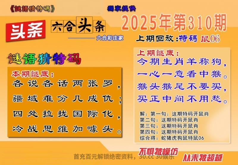 310期 各说各话两张罗 疆域难分几成仇 四处拉拢国际化 冷战思维加噱头 解译:四处拉拢国际化指04虎,冷战思维加噱头指战肖虎马狗牛 九肖:虎马狗牛龙蛇猪鼠兔 六肖:虎马狗牛龙蛇 三肖:虎马狗 一肖:虎 特码:16.28.24.36.20.32.17.29 14.26.13.25.19.31.18.30 |